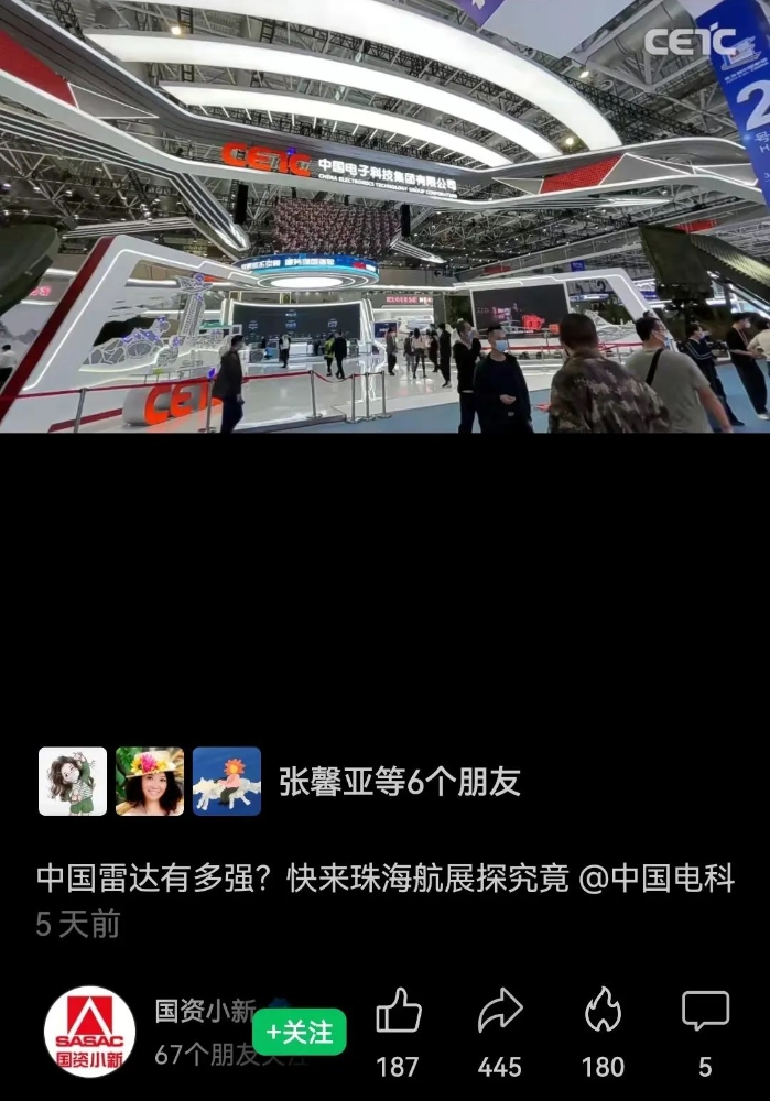 国资委新闻中心联手团中央宣传部推出的“对话新国企·大国总师看航展”专题访谈了中国电科项目总师。国家国防科工局、团中央联合国资委官方媒体分别对中国电科参展亮点进行了视频直播。国资小新推出《陆海空天网,看珠海航展央企原创产品代表作!》,报道了中国电科预警探测装备、航天装备,国资小新视频号推送了短视频《中国雷达有多强?快来珠海航展探究竟》。