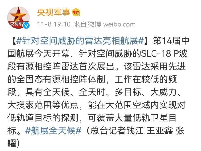 央视国防军事频道推出了《全波段情报雷达家族亮相中国航展》,详细报道了中国电科预警探测装备的特色、亮点。同时,央视军事微博报道了中国电科SLC-18 P波段有源相控阵雷达、“战鸿”空中应急指挥机。