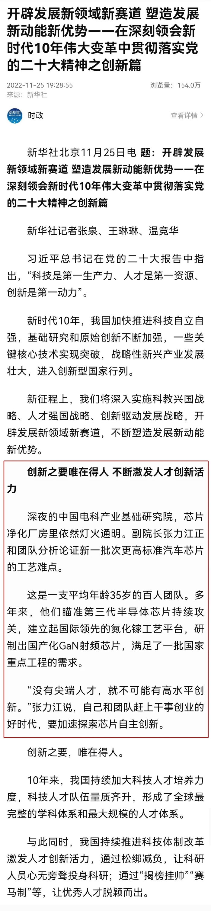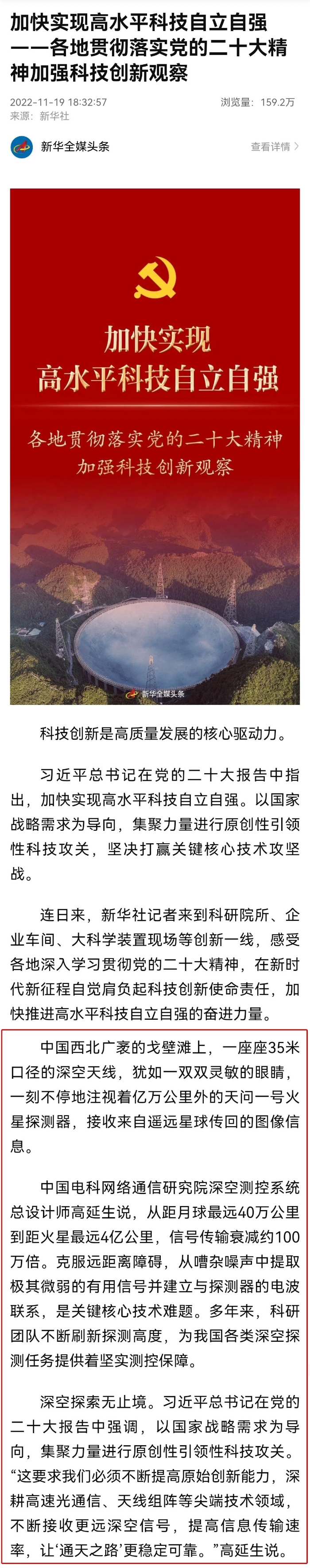 中国电科把学习宣传贯彻党的二十大精神作为当前和今后一个时期的首要政治任务,深刻领悟“两个确立”的决定性意义,增强“四个意识”、坚定“四个自信”、做到“两个维护”,坚持学懂弄通做实,切实用党的二十大精神武装头脑、指导实践、推动工作。近日,新华社连续报道中国电科以党的二十大精神为指引,坚决打赢关键核心技术攻坚战,支撑高水平科技自立自强。